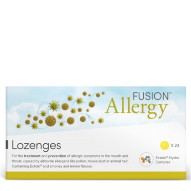 Honey and lemon flavour lozenge for the treatment and prevention of allergic symptoms in the mouth and throat, caused by allergens such as pollen, ...